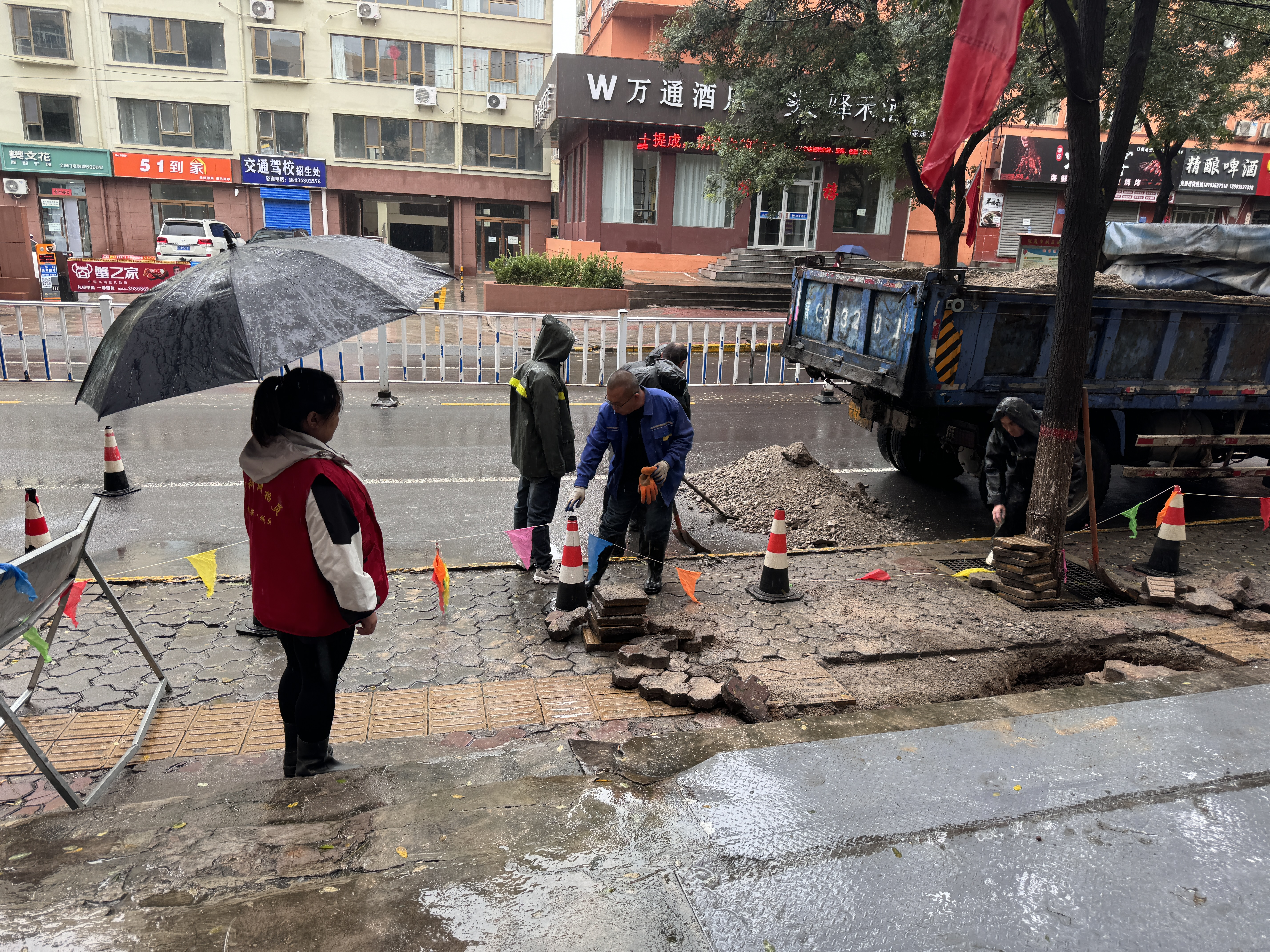 连日来,阳泉市出现持续性强降雨天气,部分社区公共设施受到影响,给居民出行带来不便。10月10日,阳泉市城区南山路街道南山南路社区工作人员在安全巡查时发现,朝阳街25号楼西侧人行道出现地砖塌陷,存在安全隐患。社区迅速启动应急机制,第一时间在塌陷区域设置警戒线并张贴安全提示,引导居民绕行,同时联系阳泉市市政工程管理处协助抢修。