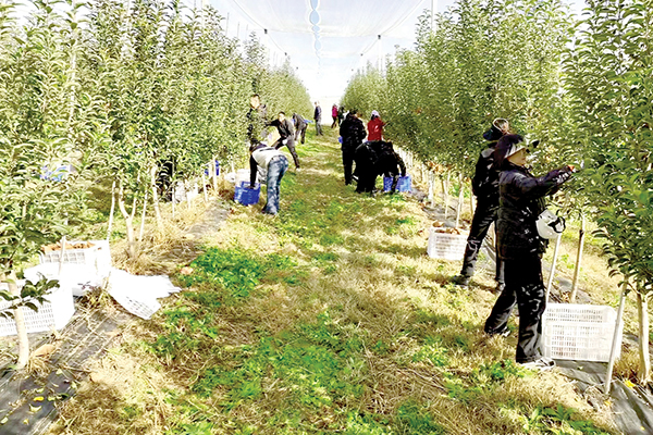 苹果收成好,工人干活也起劲。在果园里,一部分工人穿梭在密植的果树间摘苹果,另一部分工人将苹果按大小、色泽对苹果进行分级,再逐个给苹果套上防撞网套,整齐装入礼盒中准备销售。