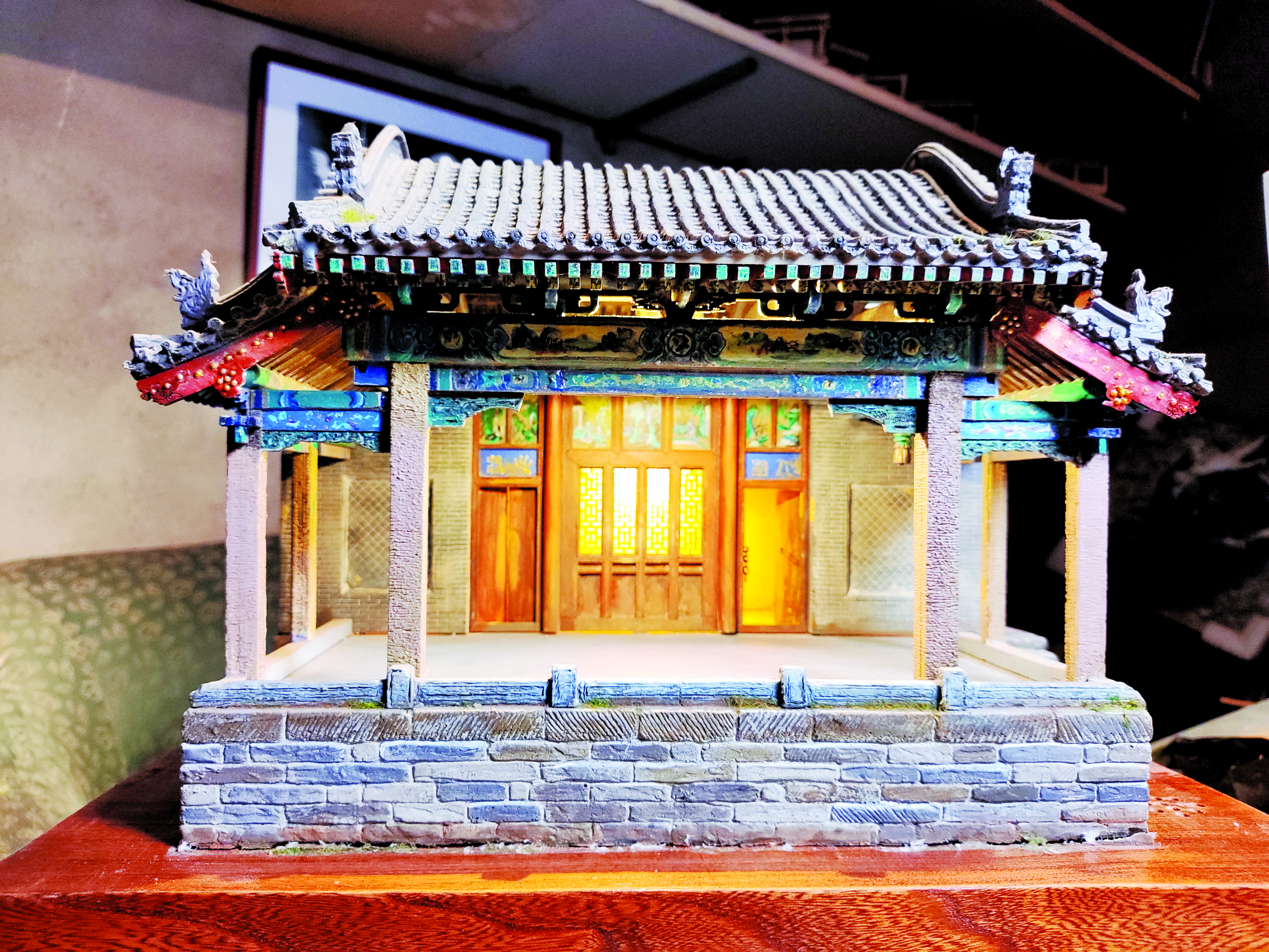为精准还原戏台风貌,马峥早在去年就开启了筹备工作,先后十余次前往小阳泉北社区实地采集戏台数据。他带着卷尺、相机,从屋顶形制到空间布局,从斗栱的榫卯结构到木雕上的纹样细节,逐一记录、拍照存档,还专门走访社区挖掘戏台背后的民俗故事。今年2月,他正式开始材料筹备,精选石料、木料作为基础材质,搭配树脂进行细节塑形。结合地方史志资料反复比对后,他将戏台等比例微缩,融入木雕、砖雕技艺精髓,耗时近半年完成复刻。