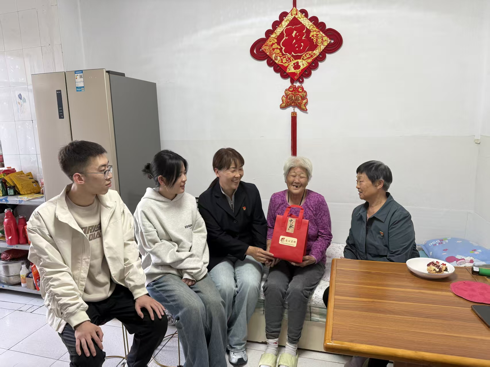 活动的“暖心闭环”体现在精准慰问环节。月饼烘焙冷却后,众人共同将其装入定制礼盒,并逐一标注慰问对象信息;随后“社区党员 圆鼎教育党员”结对组成慰问小组,带着满载心意的月饼礼盒,前往困难户、独居老人、老党员家中开展慰问。每到一户,慰问小组都耐心倾听群众需求、认真记录反馈建议,将双节祝福与党组织的关怀直接送到群众心坎上,真正实现“服务不打烊、温暖零距离”。