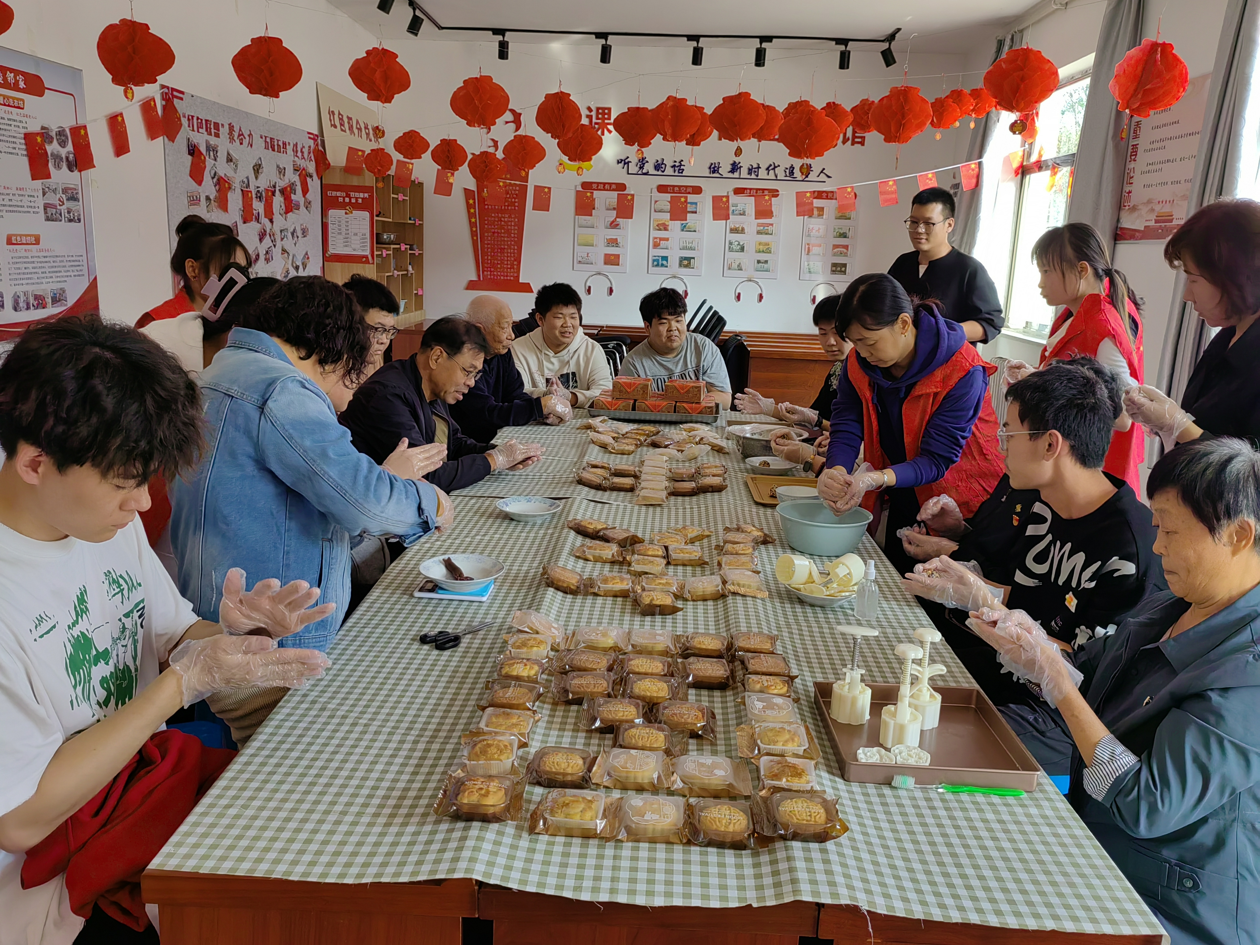月饼制作环节创新性融入“核心价值观”元素,志愿者现场演示手工月饼的和面、包馅、压模、定型等步骤,圆鼎教育的教师志愿者主动承担材料分发与技巧指导工作,过程中工作人员穿插讲解中秋民俗小故事,让参与者在掌握手工制饼技能的同时,深化了对传统文化与核心价值观的理解。分组协作阶段,“社区党员 圆鼎党员/教师 社区志愿者”的分组模式打破身份界限,各组兼顾甜咸与低糖口味需求制作月饼,党组织负责人深入各组互动交流,定格了政企同心协作的温馨瞬间。